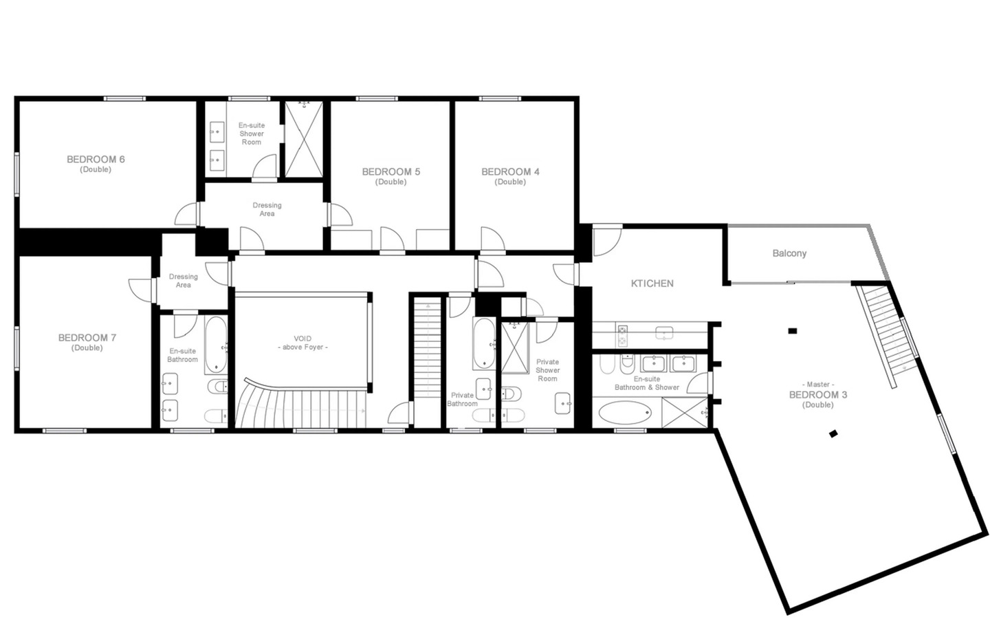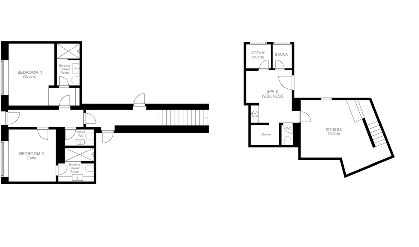 • Нижний Цокольный Этаж: Две дополнительные двухместные спальни, обе с удобствами en-suite.