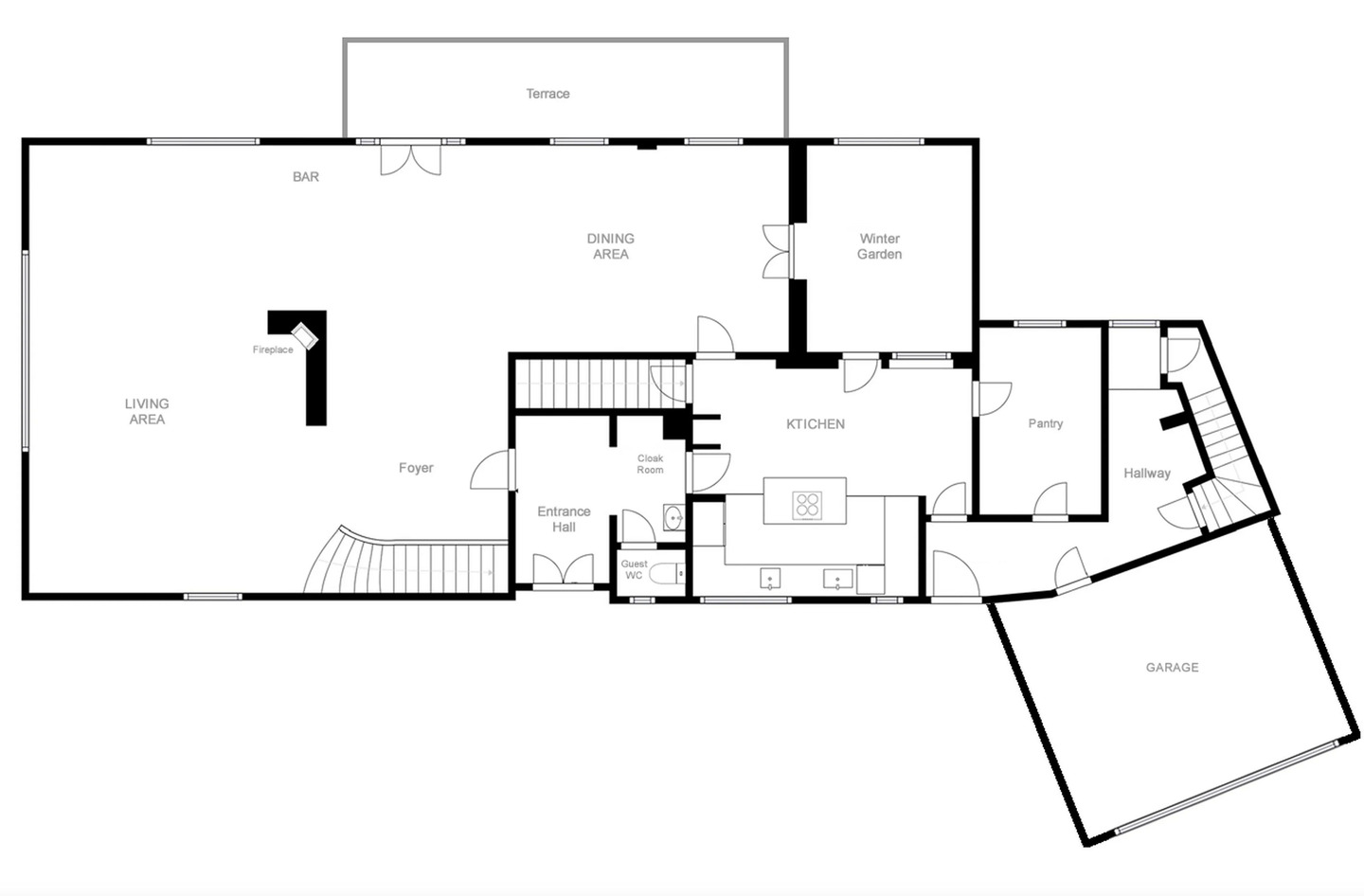 На первом этаже находится основная жилая зона, открытое и обширное пространство, располагающее к общению.